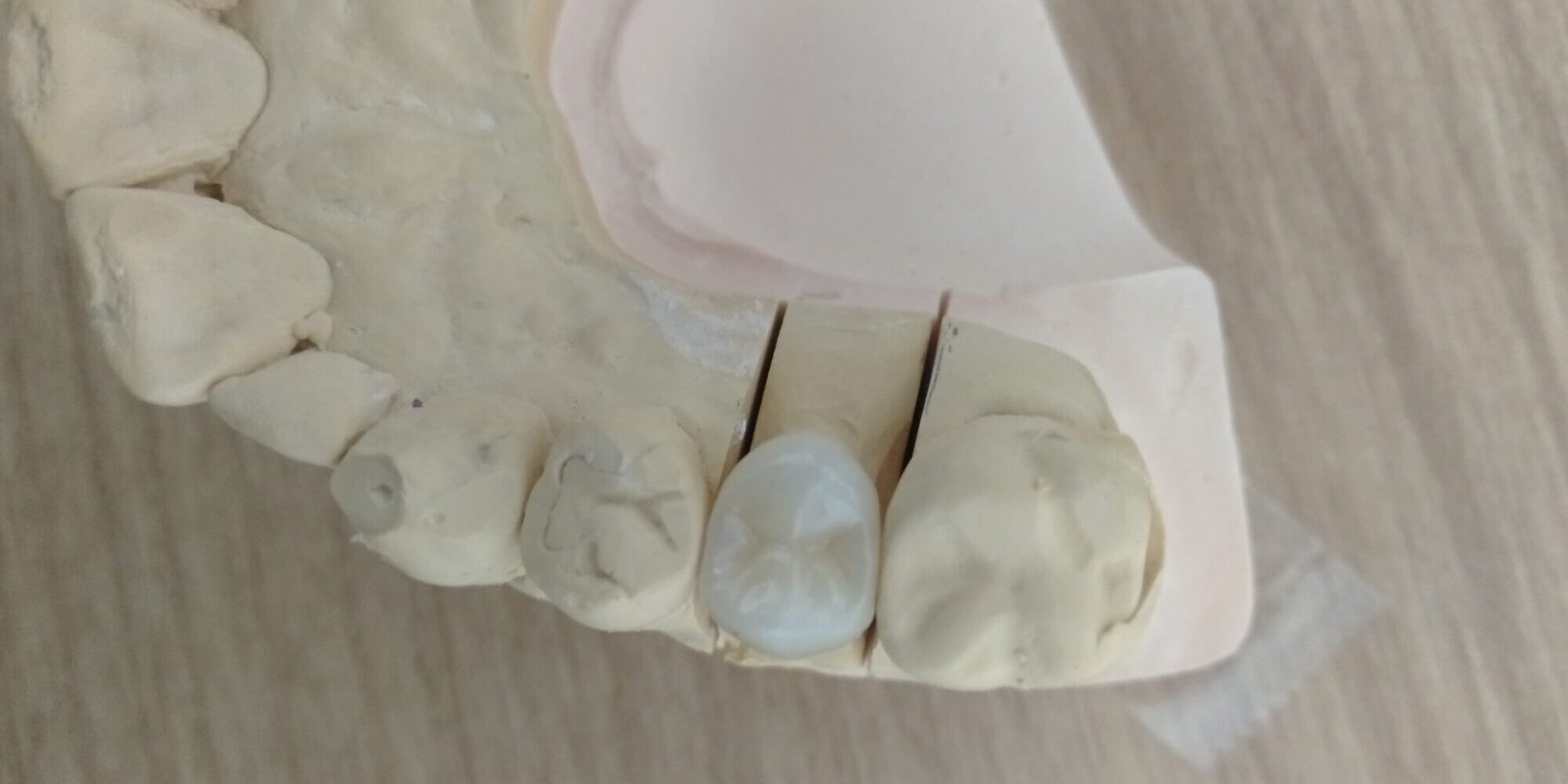 セラミックの中でもいろいろな種類がありますが、写真のセラミックは硬いジルコニアとい材料で作成しています。材料は硬ければいいというものでもないですが、このケースは反対の噛み合わせの歯がジルコニアだったので、同じ材料を選択しました。