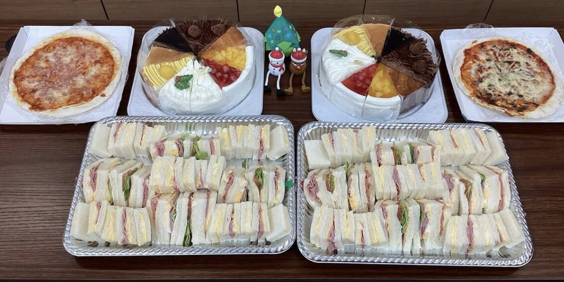 河田先生がサンドウィッチ🥪やピザ🍕ケーキ🎂などをたくさん頼んで下さり、先生とスタッフみんなで美味しく頂きました♪