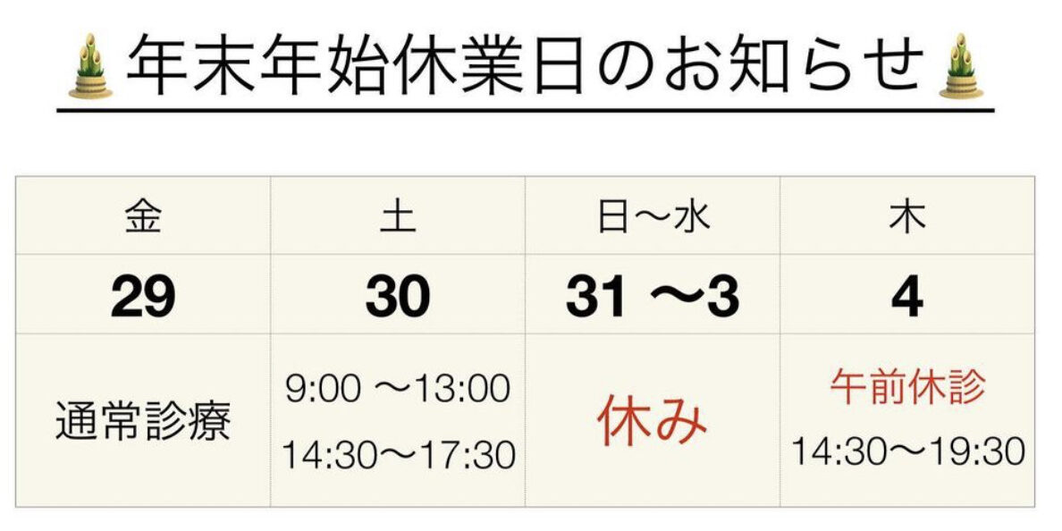 年末は12月30日まで診療していますので何かあればお気軽にお電話ください!