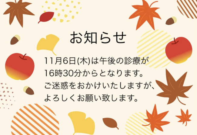 短縮診療クリニック, ニュース河田から2025年11月1日コメントする山陽西二見駅から徒歩5分の歯医者、河田大人こども歯科クリニックです。📢お知らせ📢 11月6日(木)は院長が学校検診で不在のため、午後の診療開始時間を16時30分からとさせて頂きます🙇 ご迷惑おかけしますが、よろしくお願い致します。