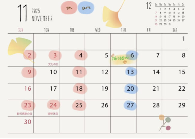 10月のの休診日クリニック, ニュース河田から2025年11月1日コメントする山陽西二見駅から徒歩5分の歯医者、河田大人こども歯科クリニックです。11月の休診日になります🍁 11/6(木)が学校検診で先生不在のため、16:30〜になります。 ご迷惑をおかけしますが、よろしくお願いします🙇朝晩がかなり寒くなって来ましたが、皆さん体調にはお気をつけ下さい🤧🍂 今月も宜しくお願いします♪🦷