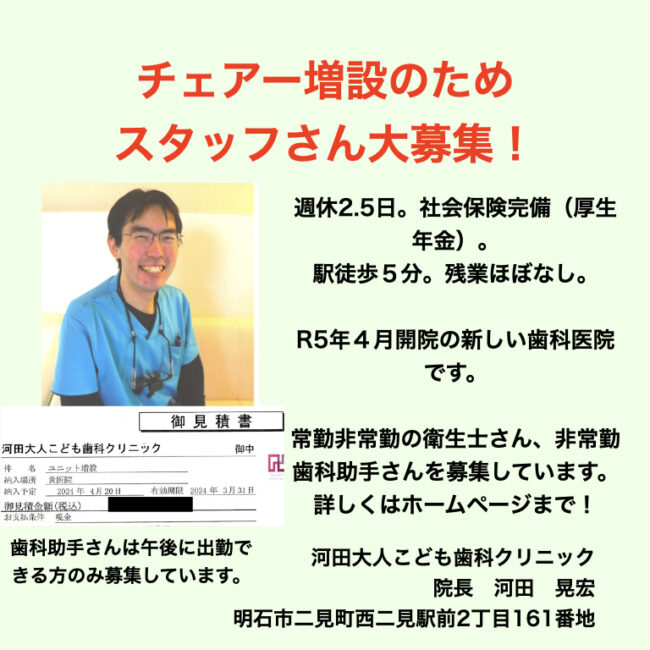 山陽西二見駅から徒歩5分の河田大人こども歯科クリニック、院長の河田です。