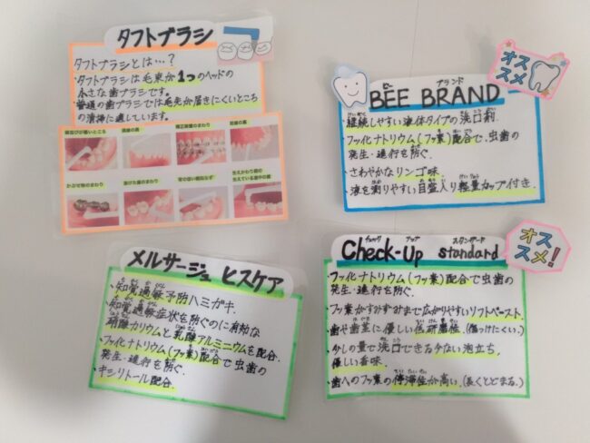 先日、当院の衛生士さんがデンタルケアグッズのポップを作ってくれました。