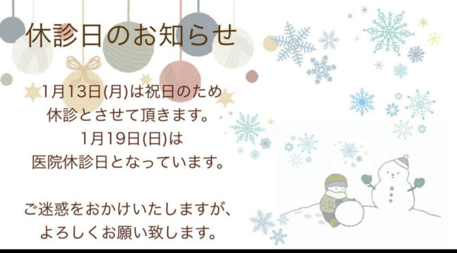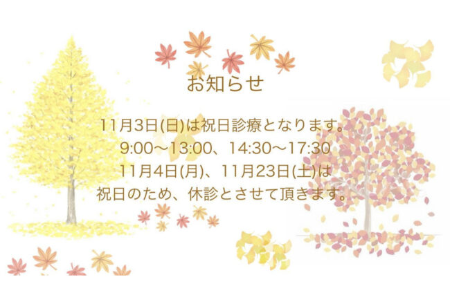 11月4日(月)、11月23日(土)は祝日のため、休診とさせて頂きます🙇🙇