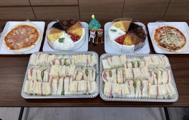 河田先生がサンドウィッチ🥪やピザ🍕ケーキ🎂などをたくさん頼んで下さり、先生とスタッフみんなで美味しく頂きました♪