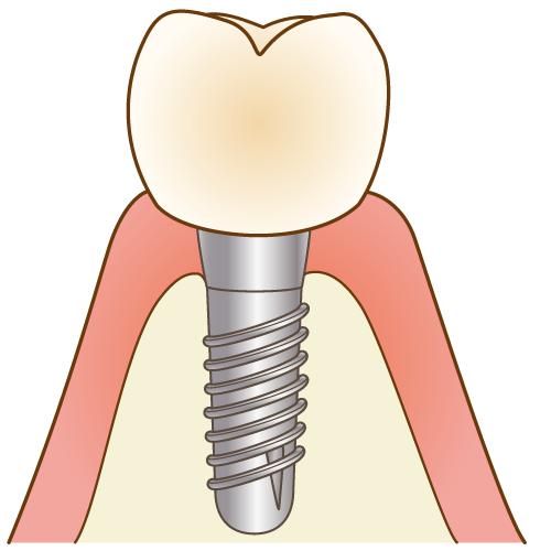 「インプラント」と呼ばれる人工歯根を歯を失ってしまった部分に埋め込み、その上に人工歯を装着することで、まるで自分の歯のような見た目や噛み心地を回復させることができます。